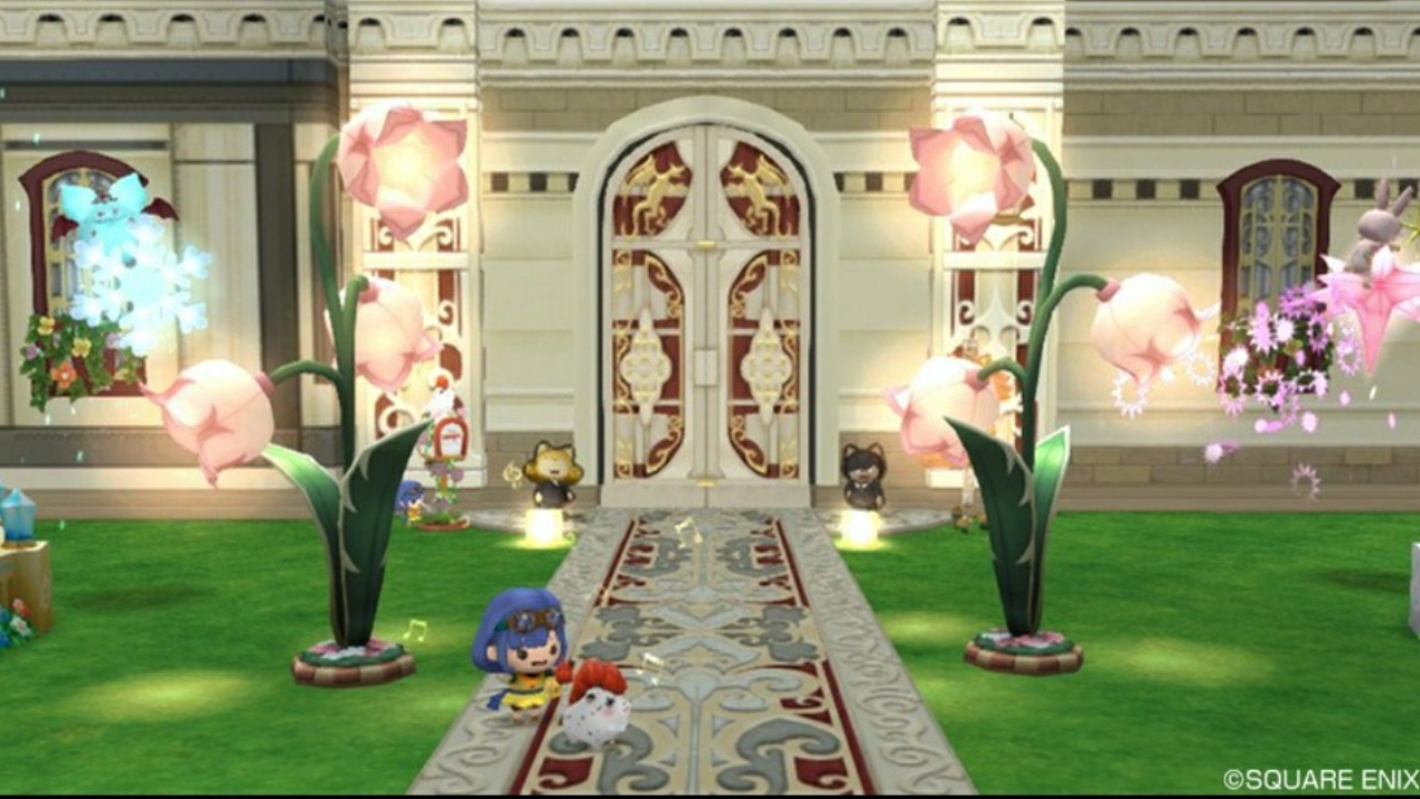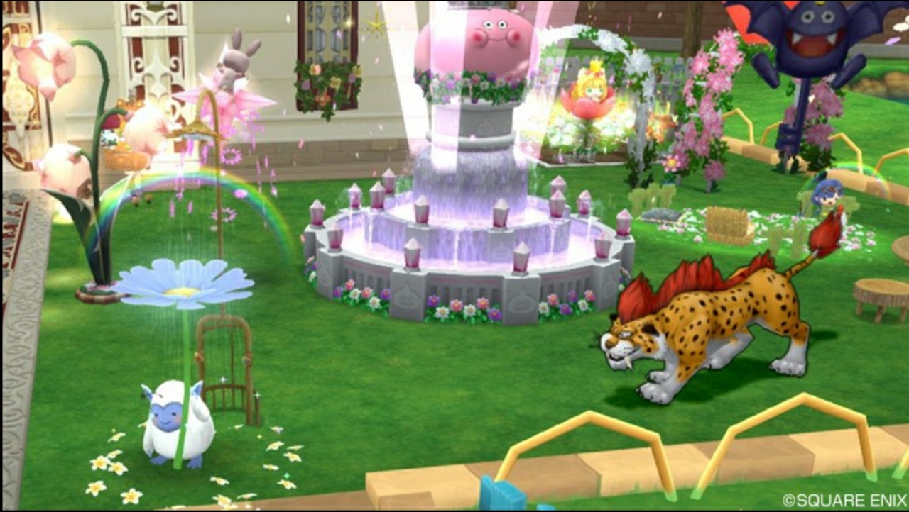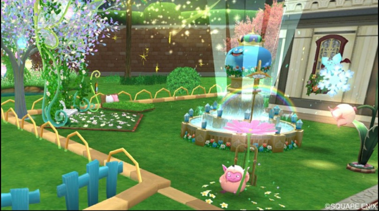 奥にはクイーンスライム噴水、お花のお庭ベッド、畑など。