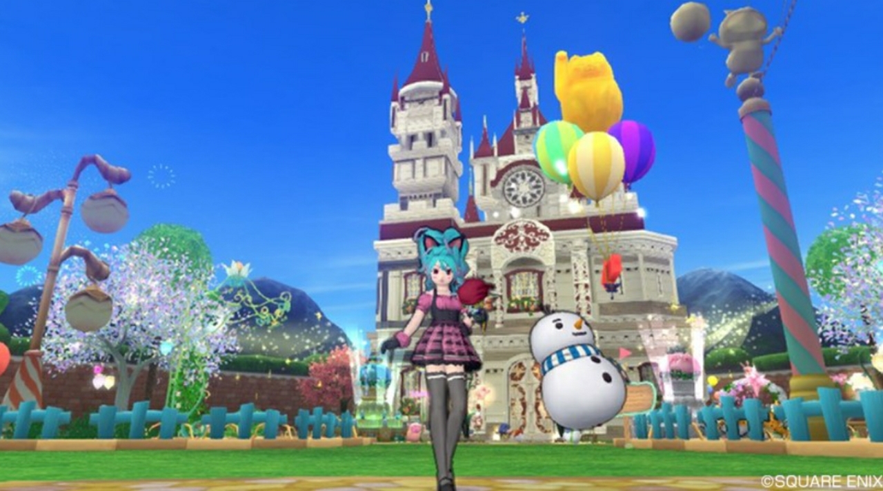 わるぼうがお出迎えするなか、奥にキングスライムの噴水、モンスターのおうちなど。スライム花火も実は上がってます☆